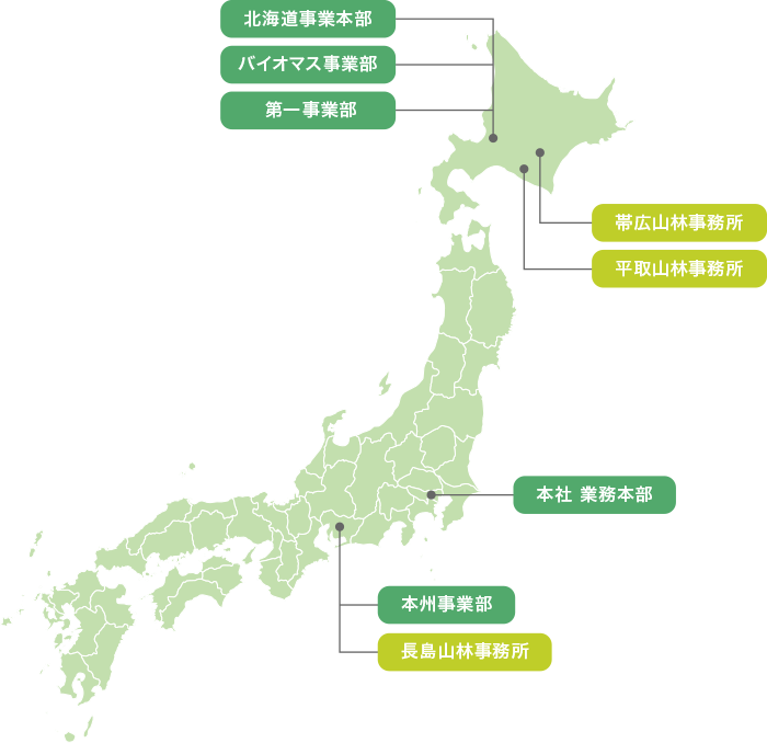 日本各地に有する三井物産の社有林を本社、北海道、本州の各事業部及び各山林事務所にて管理、運営しています。